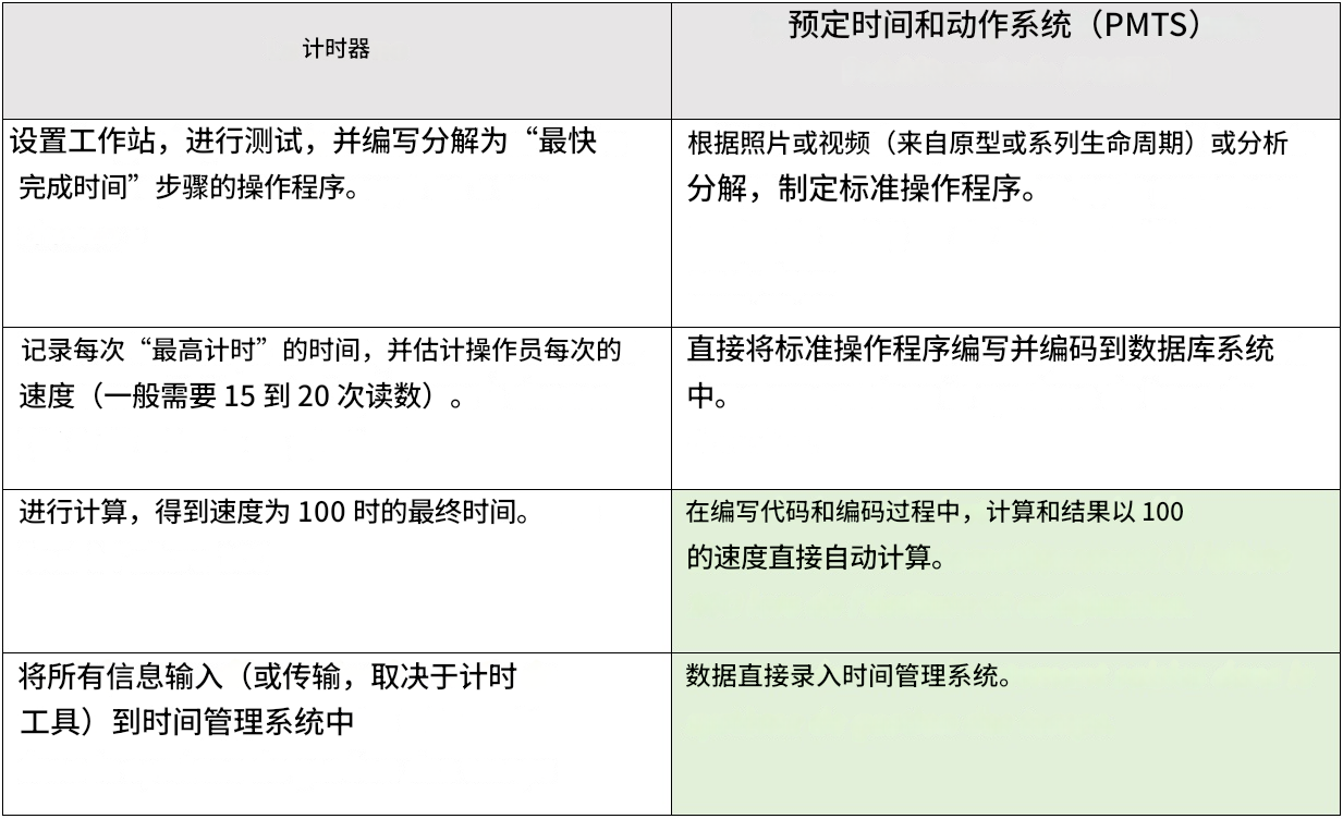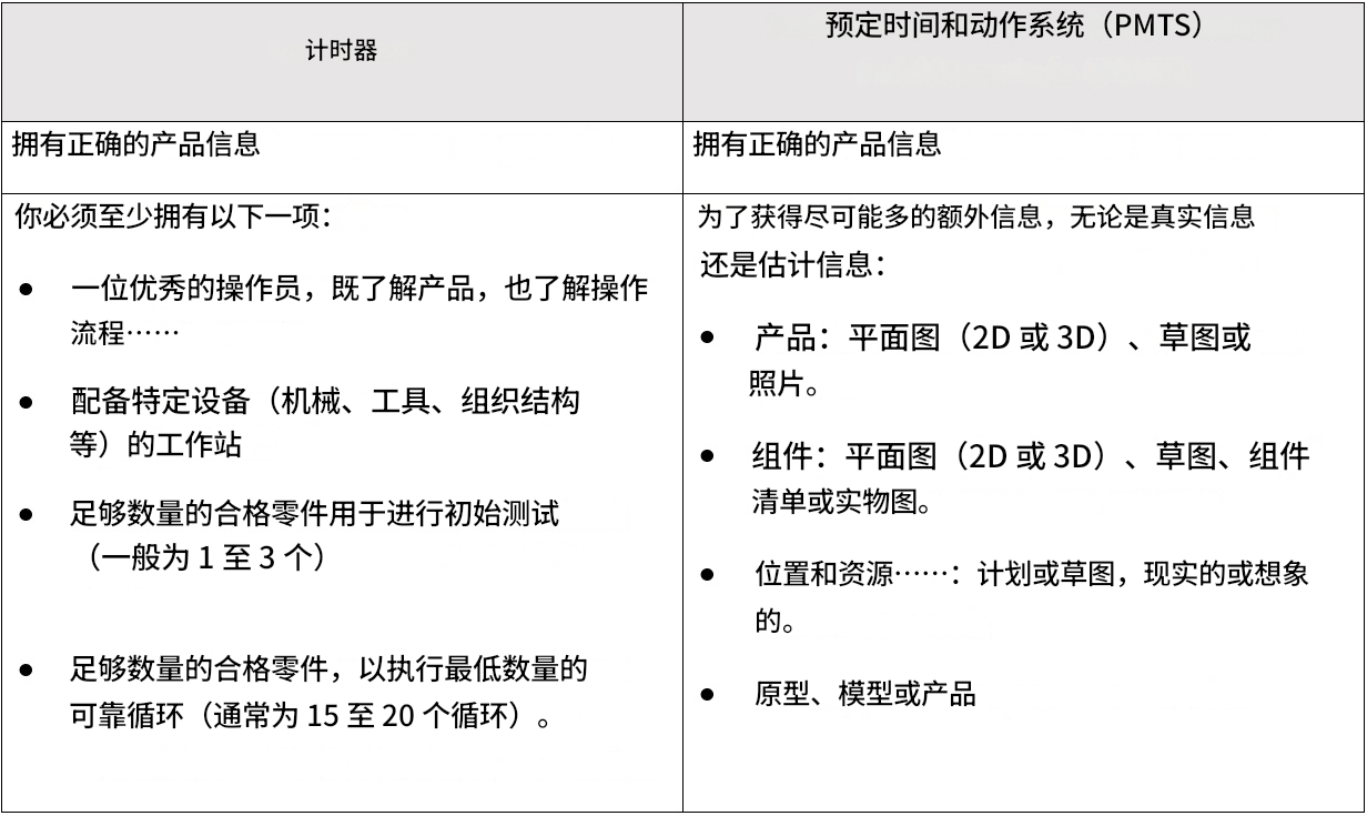 | • 由于数据精度容易受到质疑,秒表工时常被反复挑战。 | • 在实施精益或 Hoshin 改善项目期间不够灵活。 |
