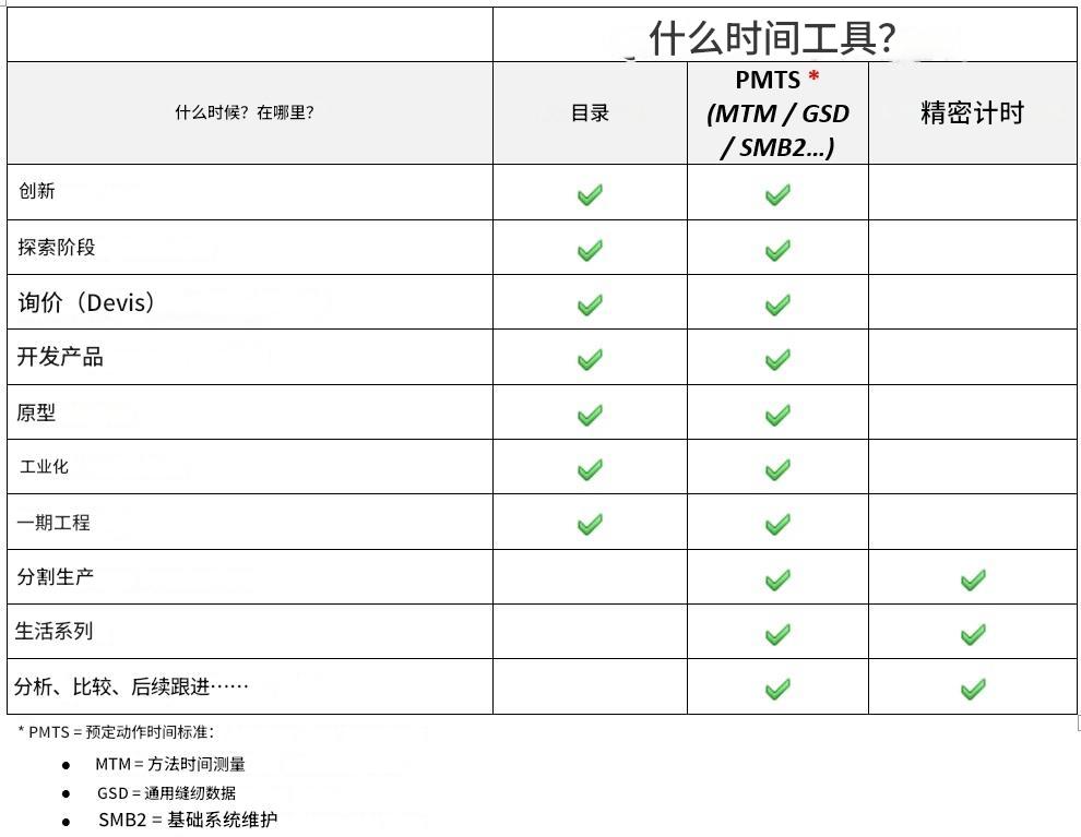 PMTS(MTM、GSD 等)则用于“量化”人们希望达到但在计算阶段尚不可见的目标。在原型、试生产或生产启动阶段,PMTS 工时往往看起来难以实现,通常被称为 “虚拟工时”。然而,只要坚持目标,纠正偏差、优化操作方法并调整组织方式,目标将逐步实现,甚至超出预期。